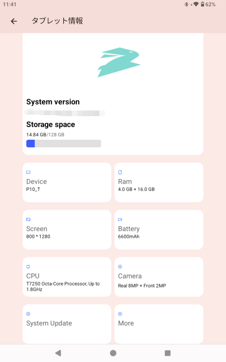 写真が何か画質が悪く暗くなっちゃんですが、、それは良いとしてしっかりと最新のAndroid16でしたね。格安Androidタブレット界隈ではスペック詐欺もあるらしいので😅、ココは安心でしょうか。